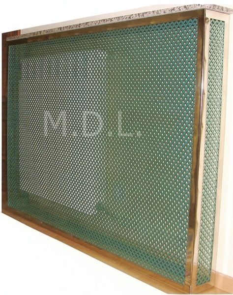 Cubreradiador fabricado en chapa perforada, pintado en tono verdoso y marco en acero inoxidable. Piedra de granito en parte superior. (Fabricamos otros modelos a gusto del cliente)